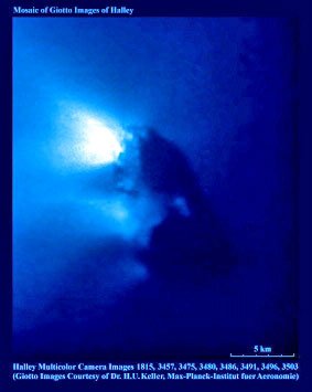 A comet was said to be a sparkling white snowy ball with some dust that was released as the sun's heat burned off the outer layers. 'Artists' full color art work dramatically reproduced the scientists' "predictions". The Giotto space craft moved closer to the comet nucleus sending back picture after picture... each one better defining the pure white potato shaped "snow ball".