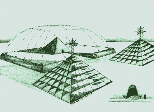 courtyard, leading to two pyramid shaped buildings. They appeared to
